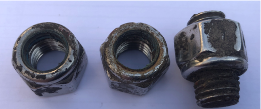 我們使用過很多種螺母與螺絲一起搭配進行防松安全緊固件連接,尼龍防松螺母是很常見的防松使用緊固件,螺絲在擰緊時擠壓穿透螺母的尼龍膠圈,通過牙紋與尼龍交圈互相脹緊防松,在低頻振動與常溫下有防松作用。如健身器材,汽車與飛機座椅等不常拆卸的場所。但是如果有超過60度高溫環境,就會出現尼龍膠脹圈氧化,生產過程中尼龍膠圈部位電鍍進水后無法徹底烘干,在使用時很容易生銹,一旦生銹后會很快大面積感污并導致整個螺母完全生銹!尼龍防松螺母在拆卸后重復使用不再有防松作用!