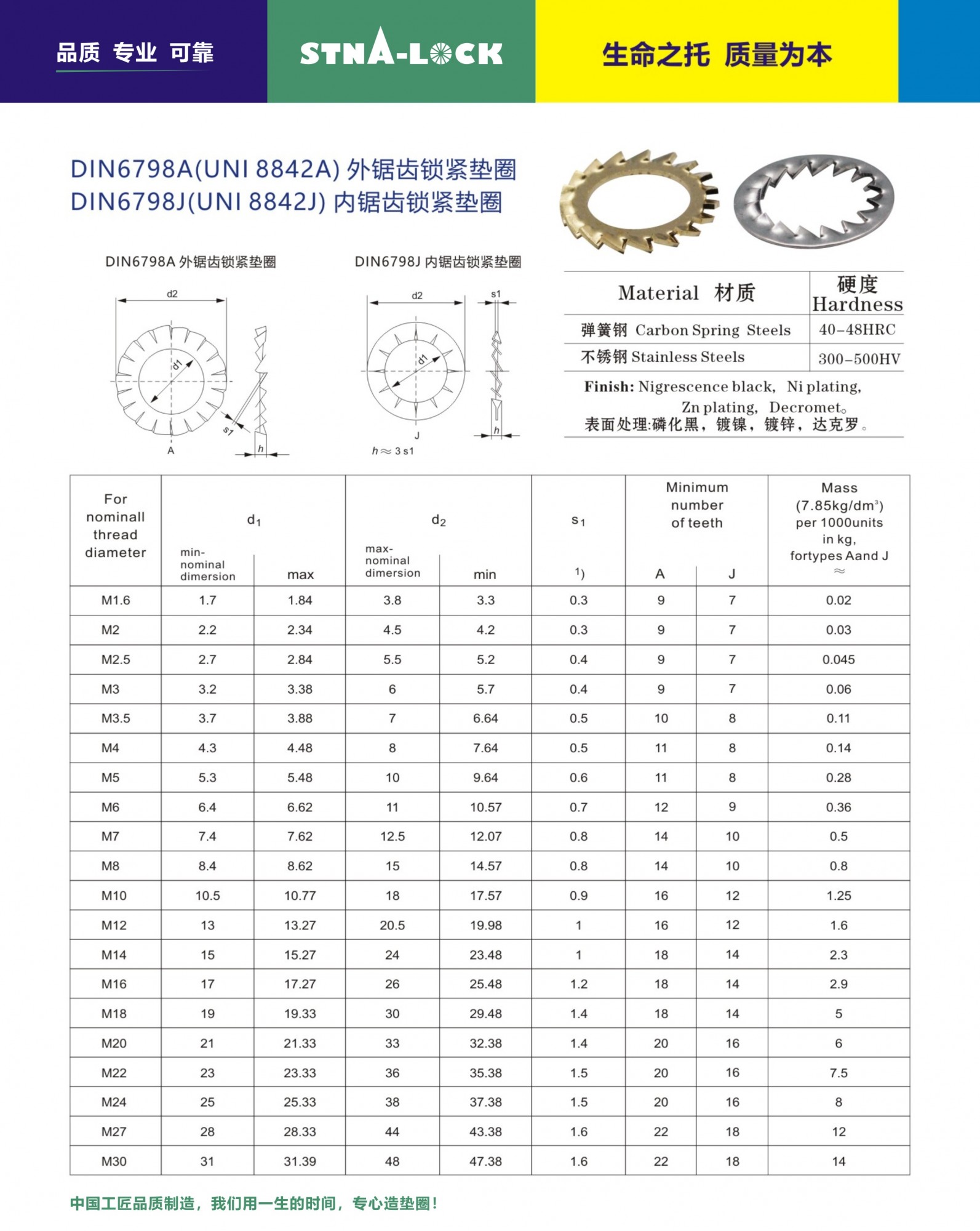 產(chǎn)品名稱:外鋸齒墊圈,外齒墊片,外鋸齒鎖緊墊圈,內(nèi)鋸齒墊圈,內(nèi)鋸齒墊片,內(nèi)鋸齒鎖緊墊圈等多種叫法,STNA-LOCK是行業(yè)知名品牌鎖緊墊圈制造商。