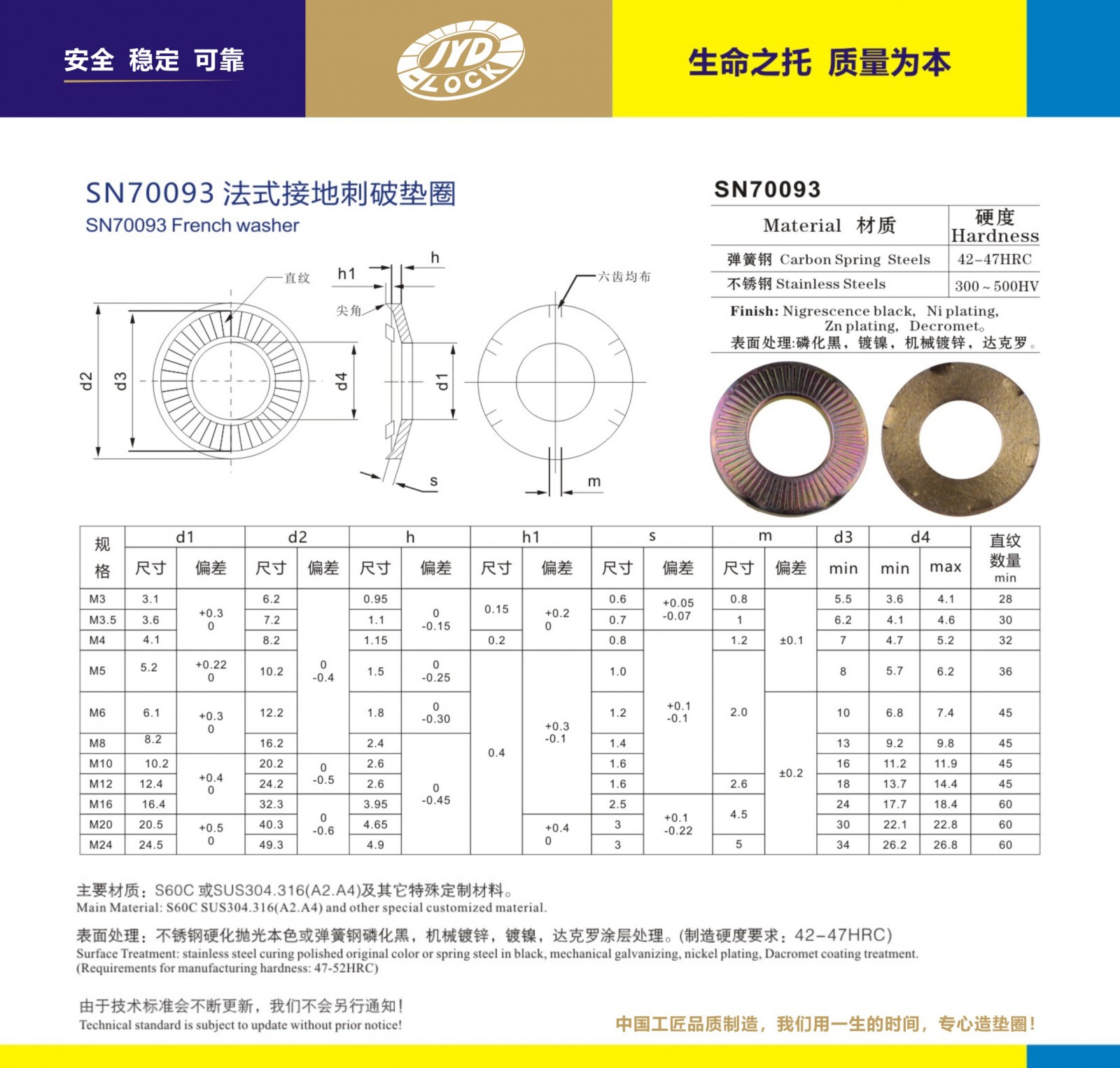 SN70093是德國西門子公司的企業(yè)標(biāo)準(zhǔn)、該墊圈是一款法式鎖緊墊圈的改良設(shè)計產(chǎn)品、表面條紋有預(yù)緊防松作用。墊圈的背面設(shè)計有六個爪形剌破角!主要功能是在配合螺栓螺釘擰緊時可以剌破金屬基體表面!主要功能是剌破作用、因此也有人叫剌破墊圈、帶爪觸地墊圈!