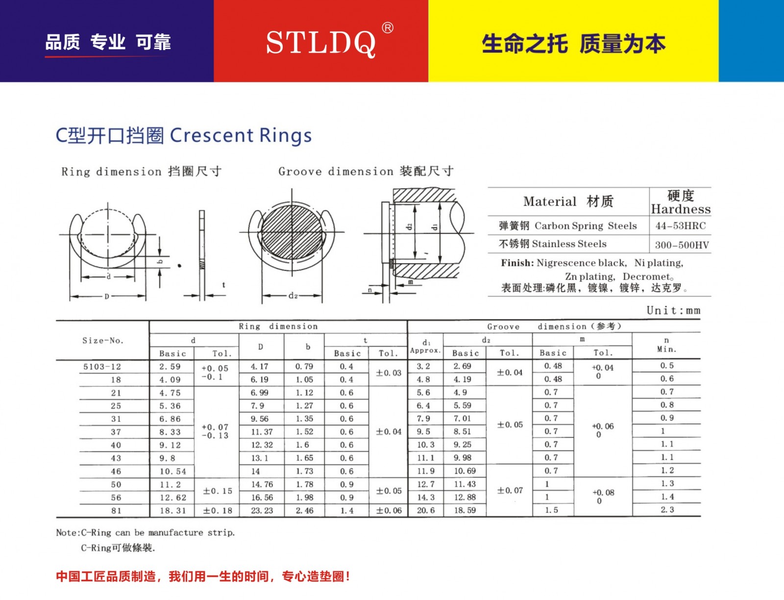 公美制C型開口擋圈,使用65MN,C67S彈簧鋼材質及SUS304.SUS316/EN1.4301.EN1.4401不銹鋼材質,硬化質量穩定回彈性好!彈簧鋼為磷化黑、機械鋅表面處理!鹽霧可達500H以上,保證無氫脆斷裂!進口精密模具制造設備,級進模自動化生產效率高成本低!